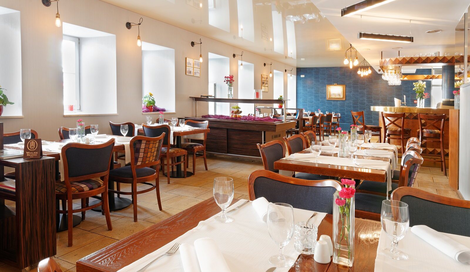 Restauracja w Hotelu Wolne Miasto to miejsce, w którym tradycja spotyka się z nowoczesnością. Eleganckie i stonowane wnętrze oraz profesjonalna obsługa sprawiają, że restauracja jest idealnym miejscem na rodzinny obiad, spotkanie biznesowe czy organizację wyjątkowych wydarzeń oraz przyjęć.